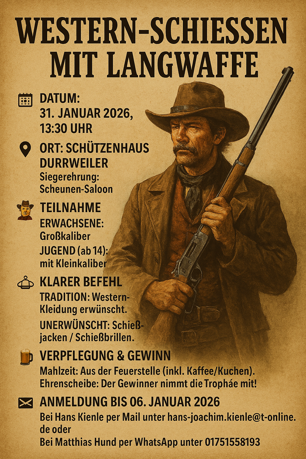 Einladung zum Westernschießen am 31.01.2026. Um Voranmeldung für Schützen und Gäste wird gebeten